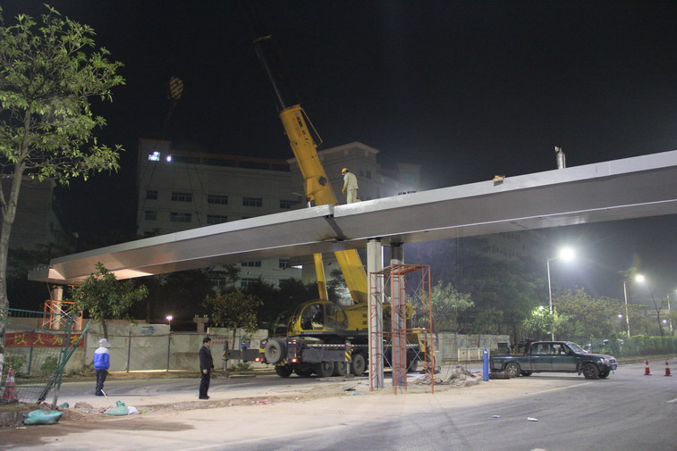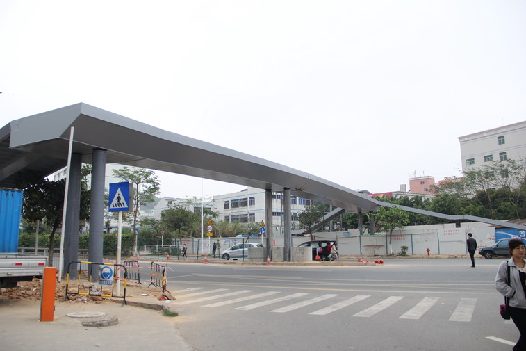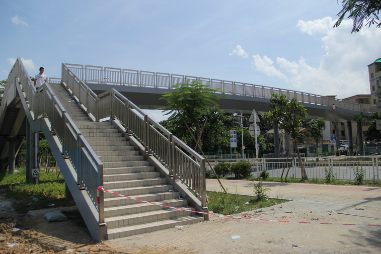 龙岗区沙荷路过街人行天桥工程包括四座过街人行天桥,灌注桩基础,钢管混凝土柱墩,钢箱梁最大跨度32m。