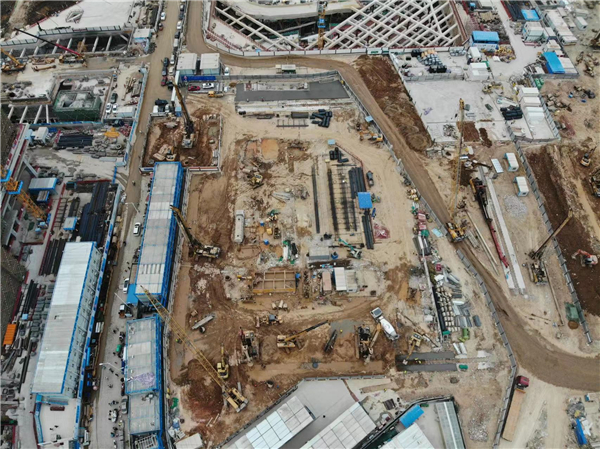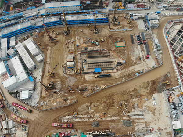基坑施工面积约9395平方米,基坑周长约388米,开挖深度约7.30m~ 14.45米,土方开挖总量约89000立方。主要施工内容为旋挖钻孔灌注桩、咬合桩、立柱桩、一道内支撑(局部两道)、土方开挖等。