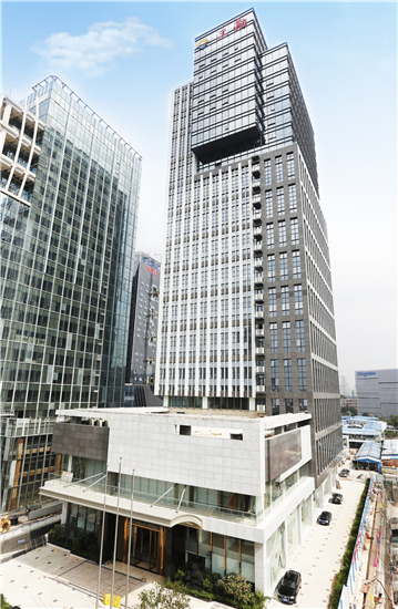 kaiyun 大厦裙楼和塔楼外立面干挂石材幕墙面积7800平方米,高度99.60m。