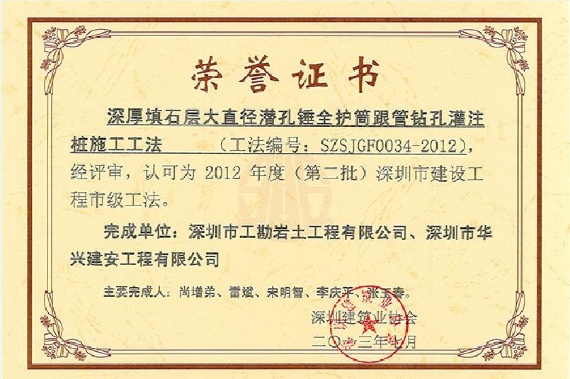 “深厚填石层φ800mm、超深预应力管桩综合施工工法”,其施工技术研究特点主要表现为三部分,即:一是穿越上部深厚填石层的大直径潜孔锤引孔技术,采用了大直径潜孔锤跟管钻进“3+1”复合引孔,穿越深厚填石层后在护筒内回填砂土,将填石层置换后起拔护筒再进行预应力管桩施工;二是超深超长预应力管桩沉入时穿透能力和垂直导向技术,使用了筒型钢桩尖代替了原设计的锥型钢桩尖,大大提高桩管的穿透力,保证了桩管的垂直度;三是预应力管桩地下水应力消散及抗浮、防爆技术,在桩管端部附近设置了专门的双向泄水孔,集中应力得以顺利释放、消散,减少了施工过程中的爆管、破管现象,确保了桩管顺利下沉到位。采用以上综合施工技术措施后,在10多米厚填石层施工大直径、55m超深预应力管桩施工达到了满意效果,其技术水平经专家鉴定达到国内领先。