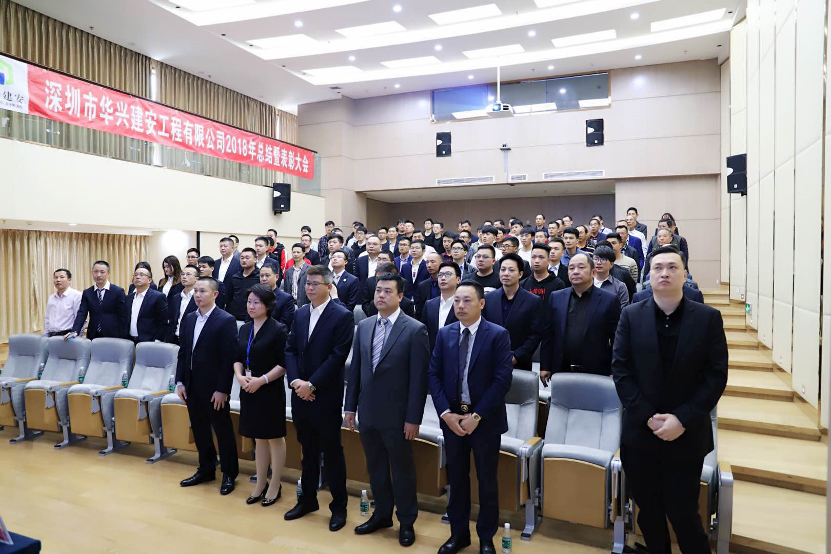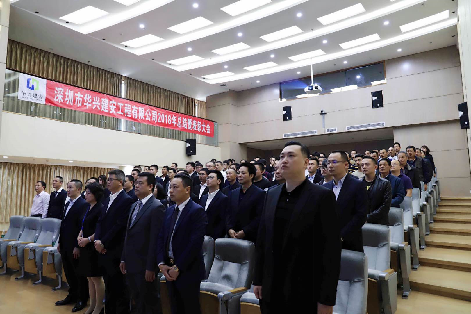 最后,华兴建安员工全体起立,大会在《歌唱祖国》乐曲中顺利闭幕!